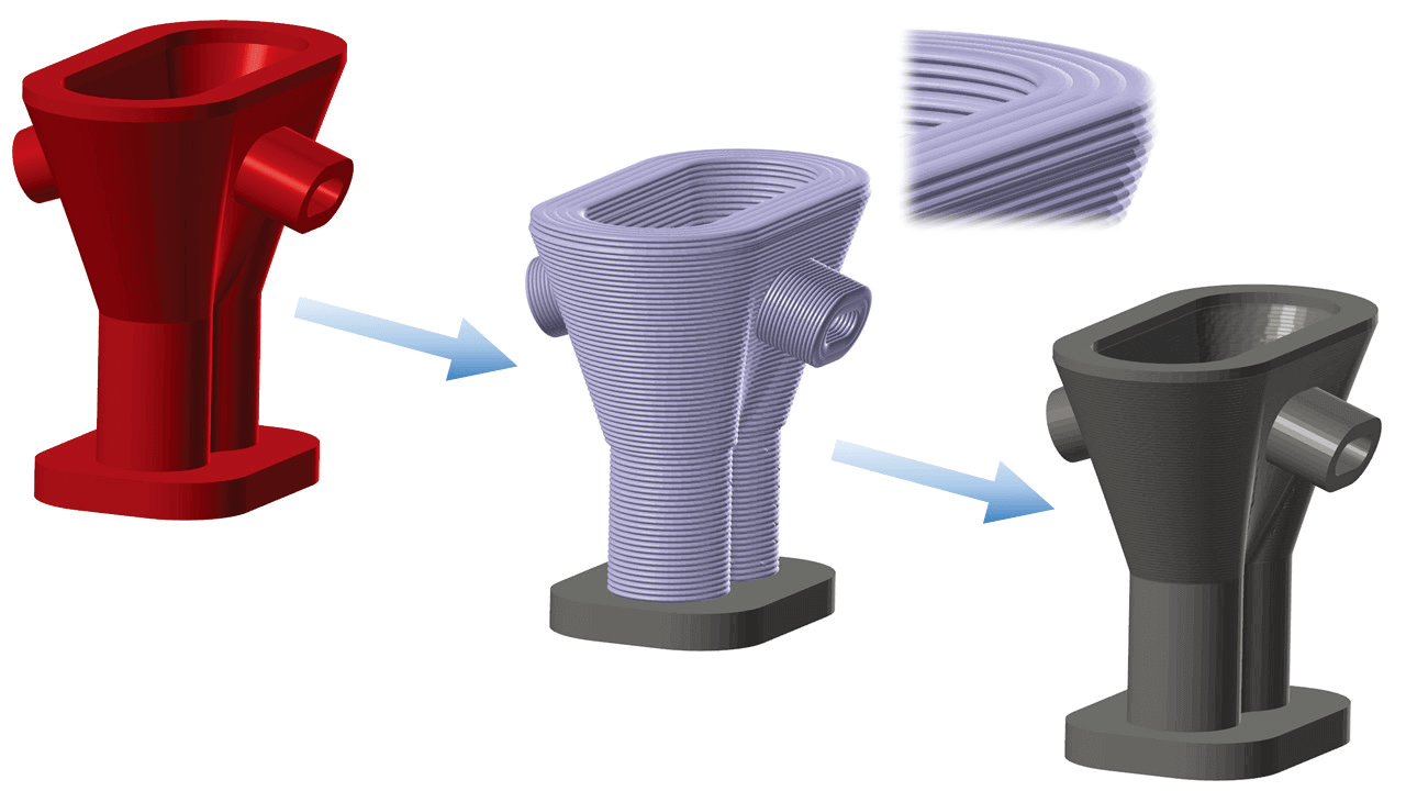 平面を基準とし、レイヤー高さに合わせてスライス処理を行い、積層パスを生成します。