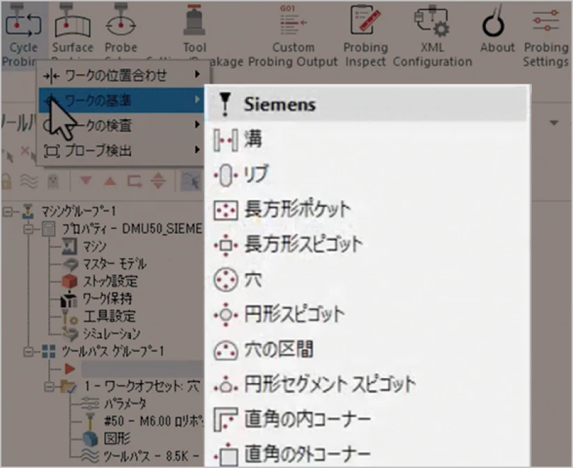 機械メーカーの純正サイクルをそのまま活用OK、加工パスと同じ感覚でプローブ計測をプログラミング。