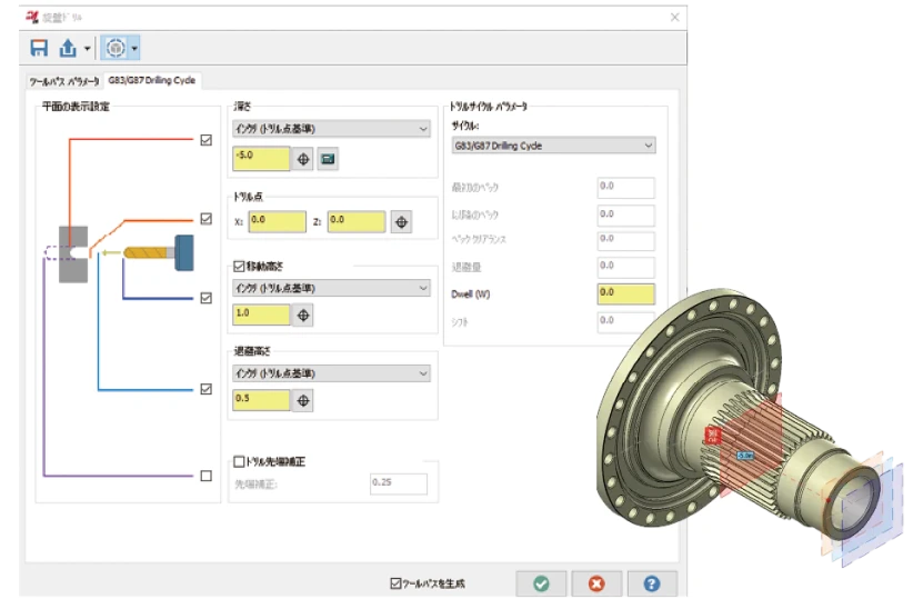 旋盤ドリルで深さ・ドリル点・移動高さ・退避高さなどのグラフィック平面表示が可能になりました。