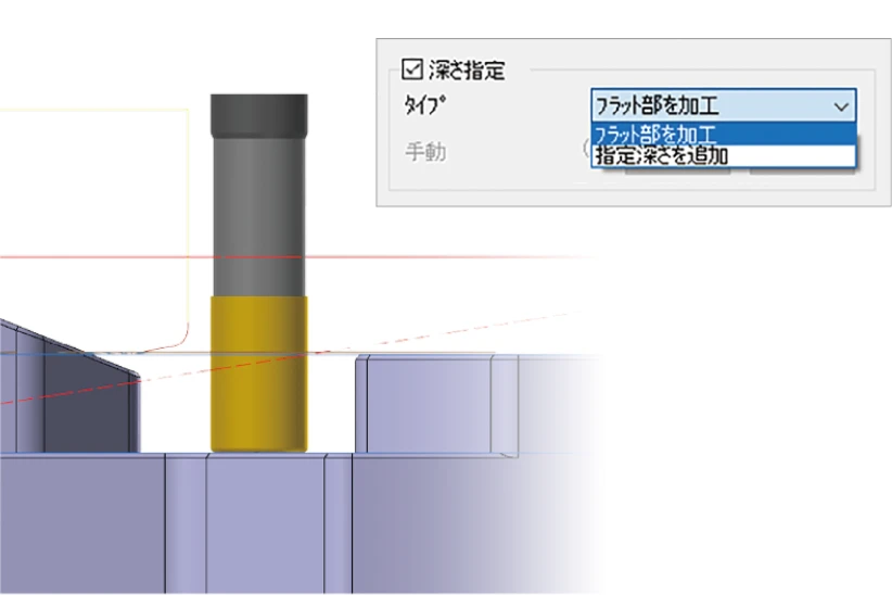 深さ指定のメニューで途中のフラット部を自動検出し、加工できるようになりました。手動設定も可能です。