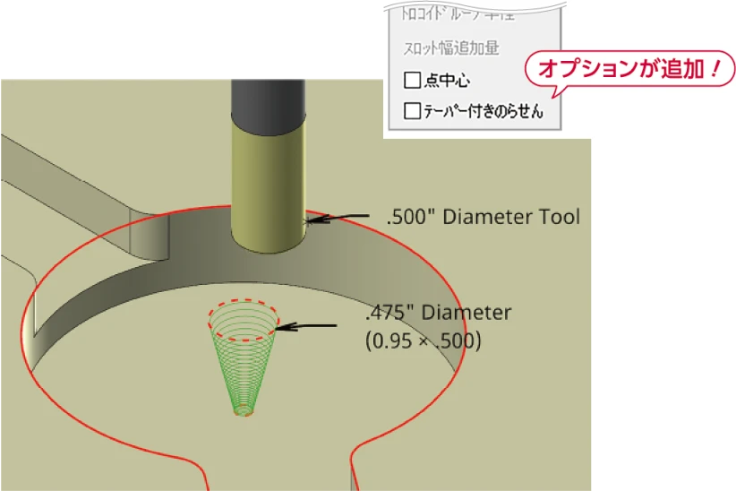 オプティラフ加工とダイナミック加工の進入らせん動作にテーパーオプションが追加され、加工の効率化に寄与します。