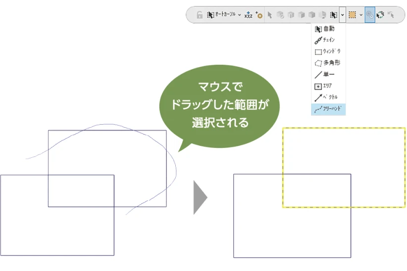 グラフィック画面上の要素を、マウスボタンをドラッグすることでフリーハンド選択できます。